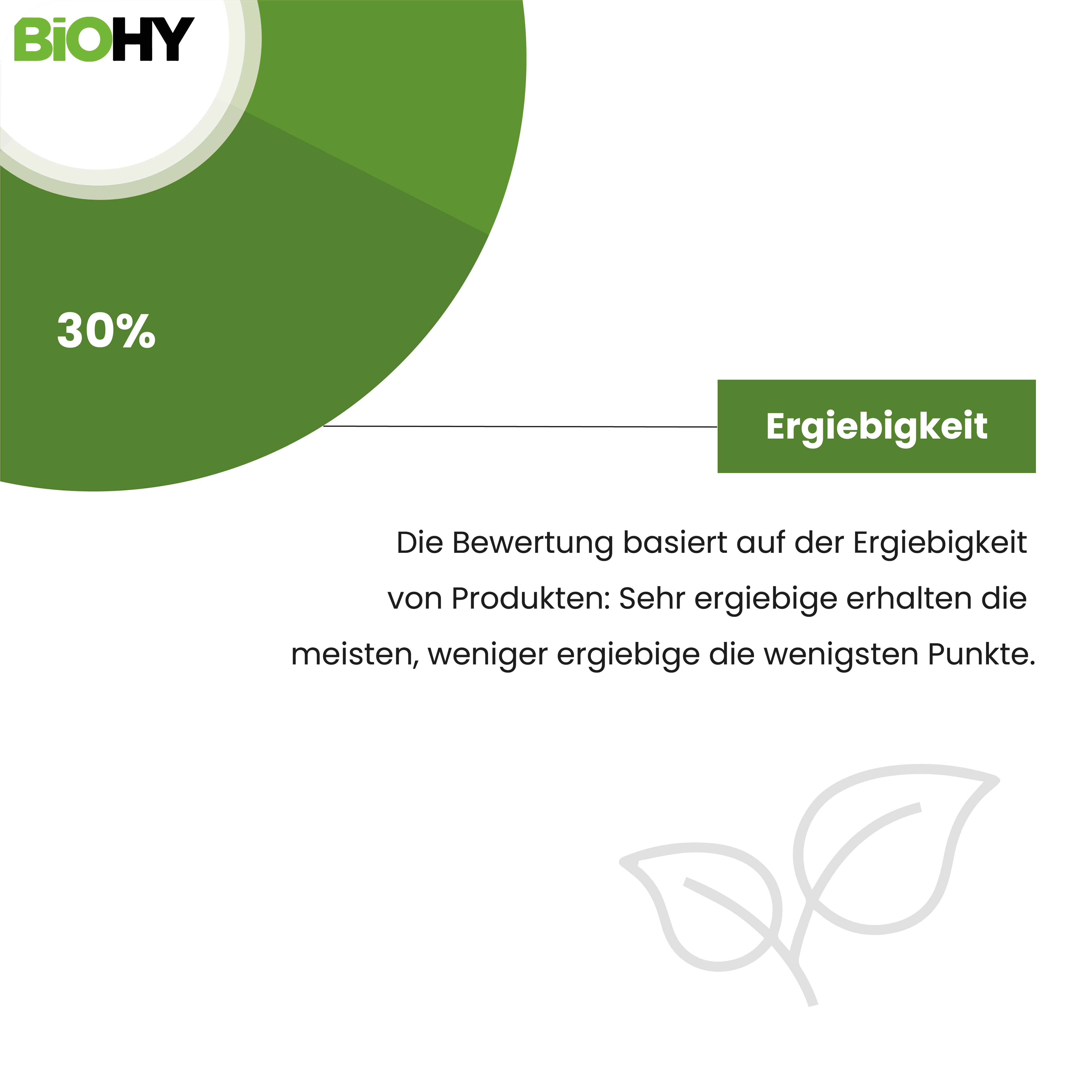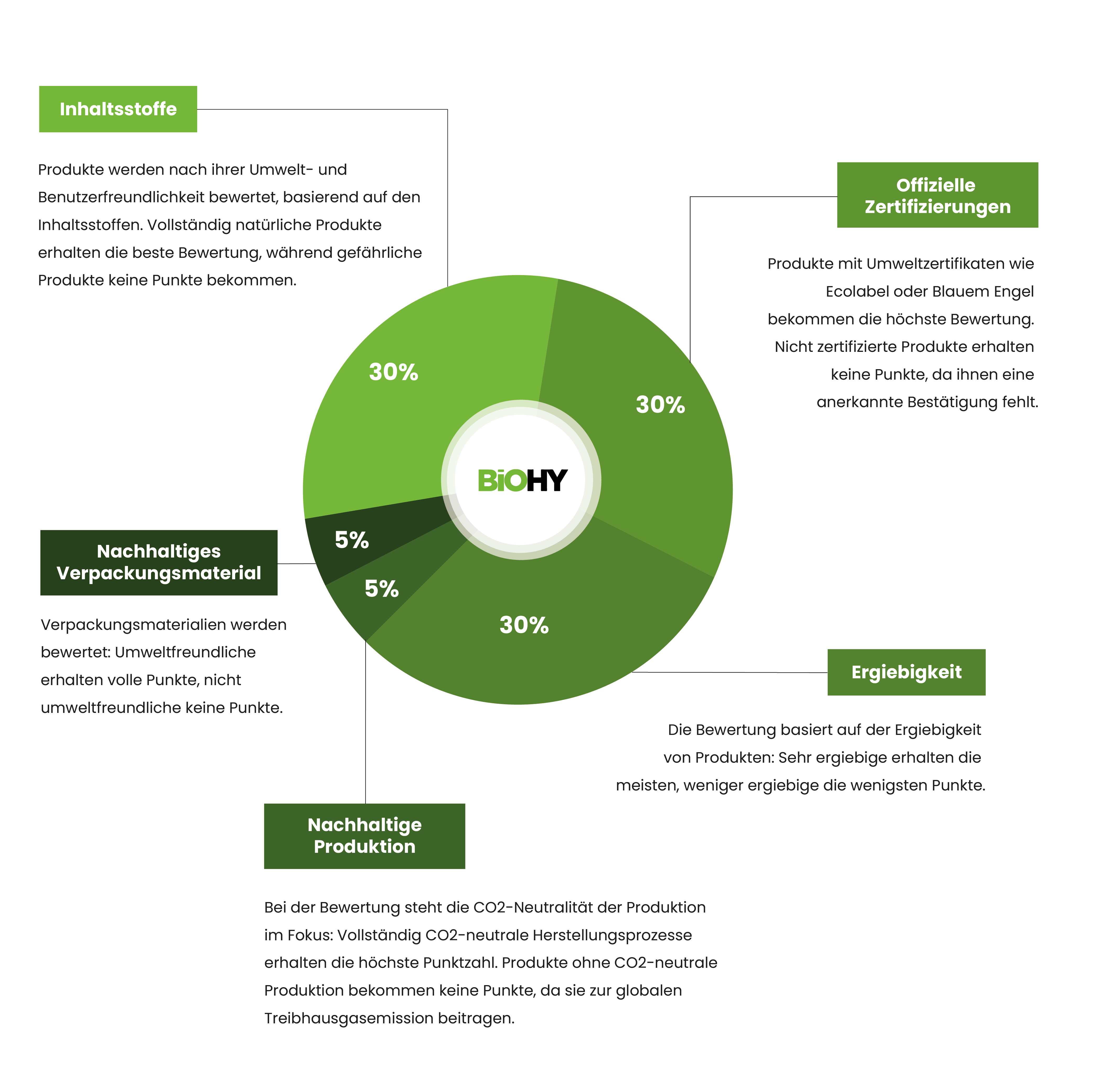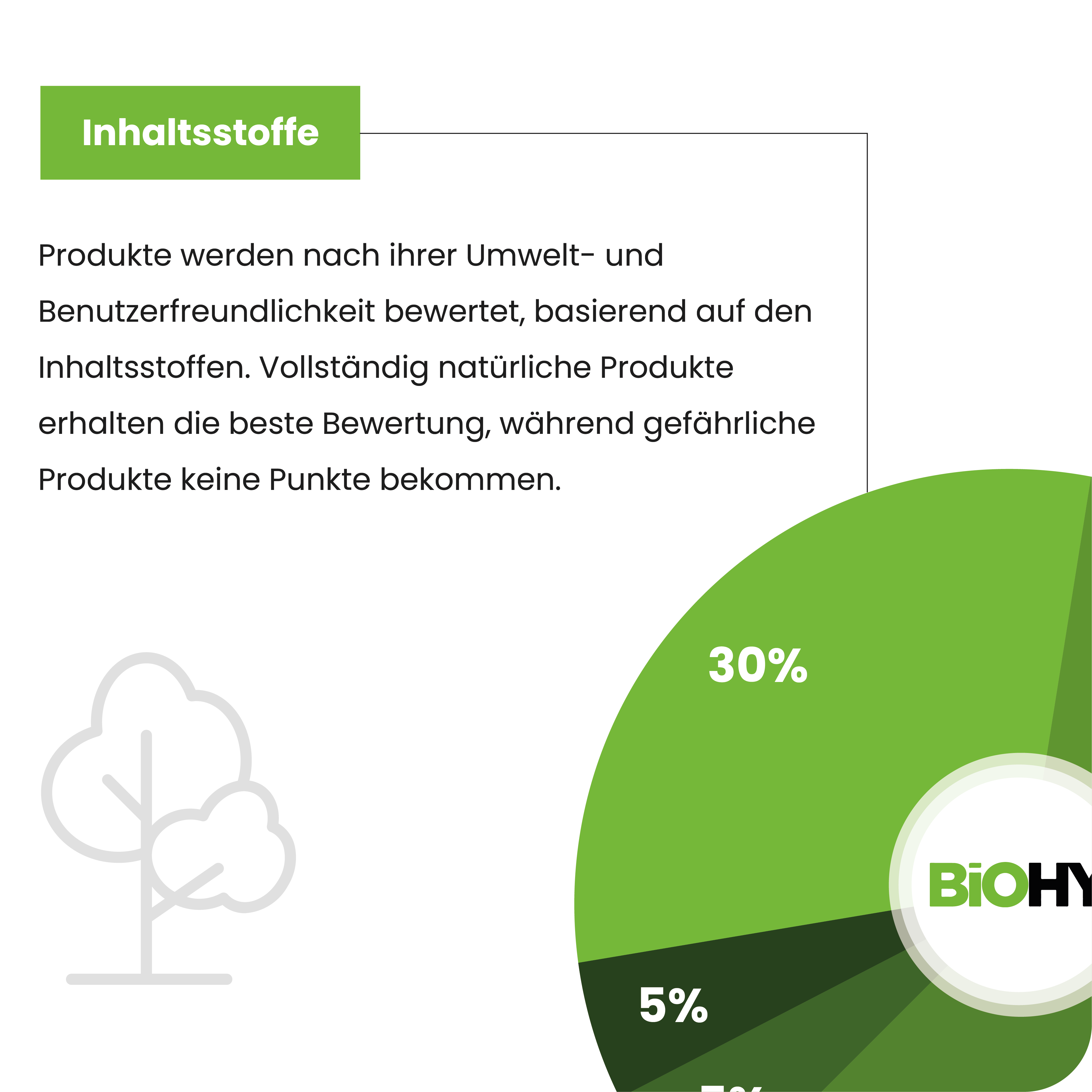 Bei BiOHY haben wir ein einfaches und effektives Bewertungssystem entwickelt, um die Nachhaltigkeit unserer Reinigungsmittel transparent darzustellen. Dieses System ist nicht nur für unsere Produkte gedacht; Sie können es auch nutzen, um andere Reinigungsmittel zu bewerten. Die Gesamtbewertung basiert auf fünf Kriterien, die jeweils unterschiedlich gewichtet sind. Jedes Kriterium kann bis zu 100 Punkte erreichen, und die Summe dieser Punkte ergibt eine Gesamtbewertung von maximal 100 Punkten.