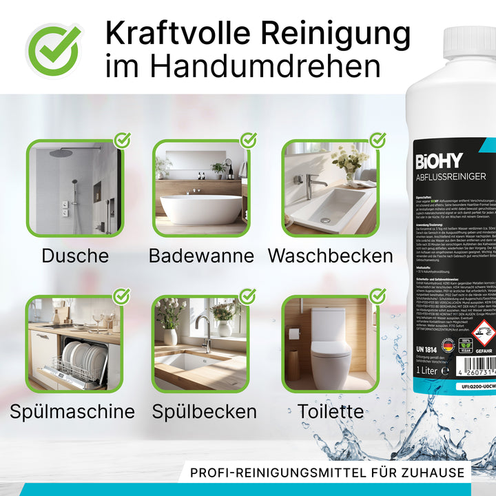Sollte sich aufgrund einer Rohrverstopfung Wasser in der Dusche oder im Waschbecken angesammelt haben, entferne dieses zunächst. Schütte dann die fertige Mischung in die Ausgussöffnung und lasse den Reiniger ca. 30 Minuten einwirken. Spüle anschließend mit klarem Wasser nach und überprüfe, ob der Abfluss wieder funktioniert. Sollte dies nicht der Fall sein, wiederhole den Vorgang und prüfe erneut. Unser Rohrreiniger ist sehr intensiv, also achte bitte darauf, die Flasche nach Gebrauch wieder gut zu verschließen! Besonders praktisch: Das Reinigungsmittel eignet sich auch zum Auftauen zugefrorener Rohre.