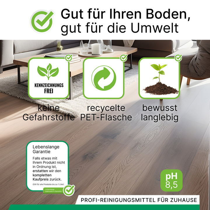 Per utilizzare il detergente per laminati, diluire il concentrato di circa lo 0,5% (5 ml/1 litro d'acqua). Adatto anche per macchine per la pulizia. Puoi trovare informazioni più dettagliate sull'applicazione e sul dosaggio qui. (Link) Importante: non utilizzare su laminato non sigillato!